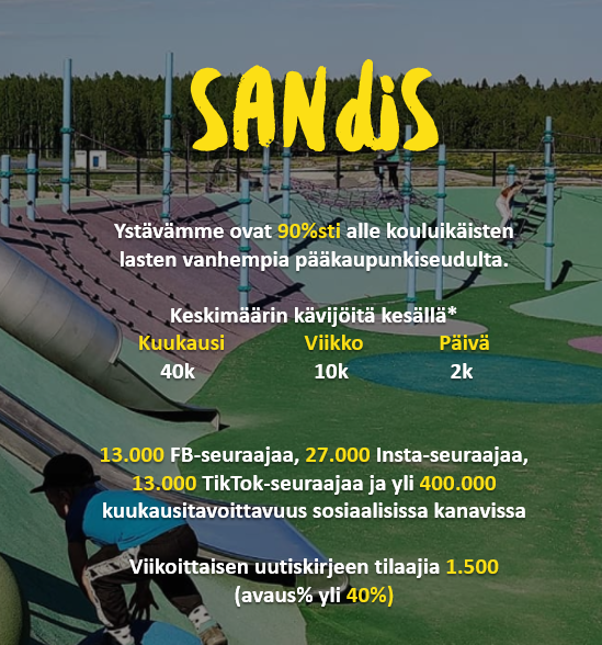 Sandis tarjoaa ruuhkattoman ympäristön mainostaa ruuhkavuosien sankareille. Tuottamamme ja koostamamme tiedon takia palvelumme on suosittu pääkaupunkiseudun lapsiperheiden parissa. Teemme erittäin suosittuja esittelyvideoita sosiaalisen median kanaviimme Instagram, TikTok, Facebook ja verkkosivuiltamme käydään katsomassa menovinkkejä perheille - olivatpa ne paikallisia lastentapahtumia tai vinkkejä kotimaan matkailuun.